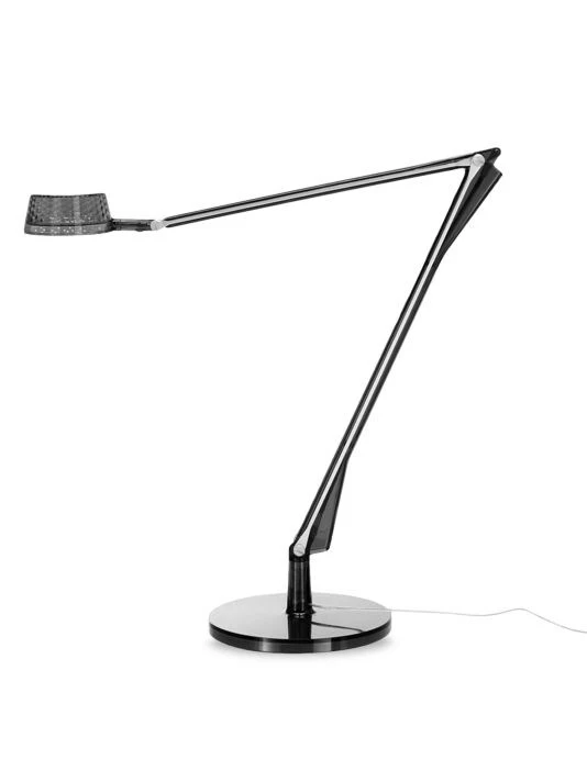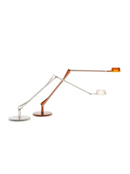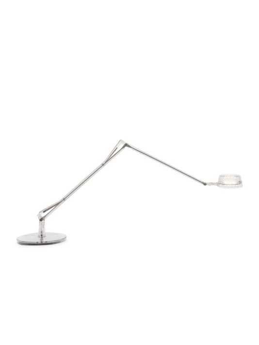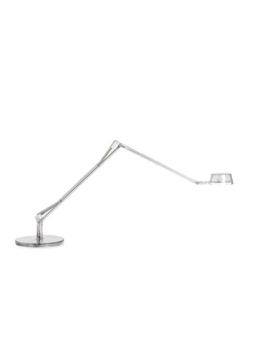Aledin Dec is a LED task lamp defined by the faceted decoration of its cone-shaped diffuser. On this model, the luminous beam throws a wider and more atmospheric light which well lends itself to residential applications. The two articulating arms in polycarbonate are characterized by two aluminum rods endowed with a conductivity function.