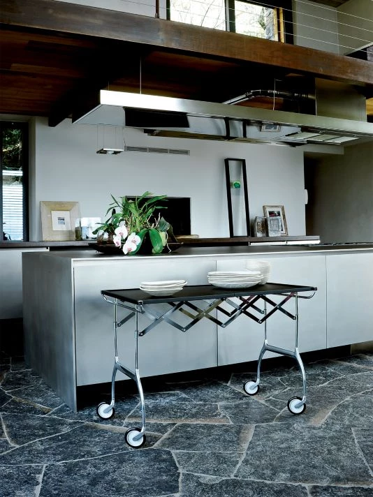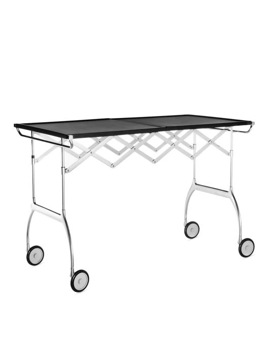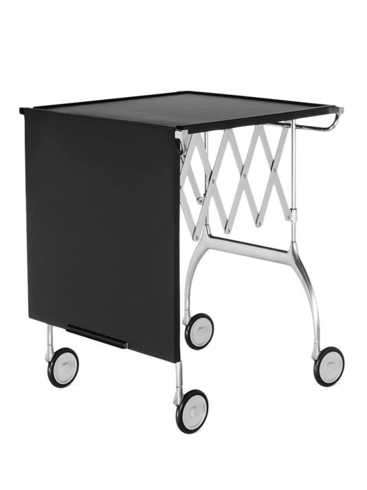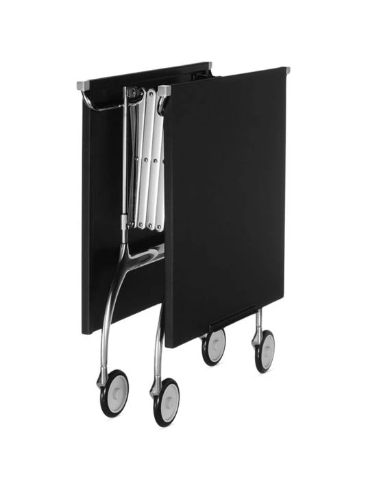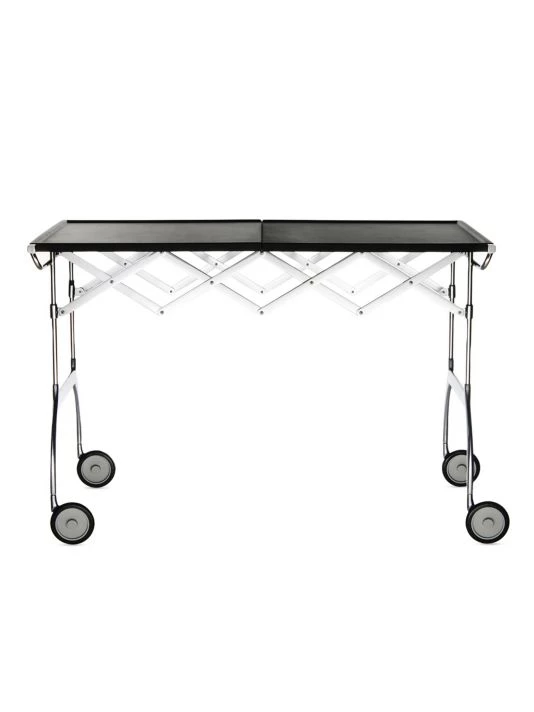 Besides being a practical trolley characterized by the successful combination of plastic and metal materials, Battista is proposed as an extensible and folding table, ideal for buffets and cocktails or for use as an occasional table.