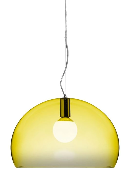 From the Fl/y Collection. Resembling a soap bubble, this transparent pendant lamp designed by Ferruccio Laviani is cut just below the diameter for a greater concentration of light.
