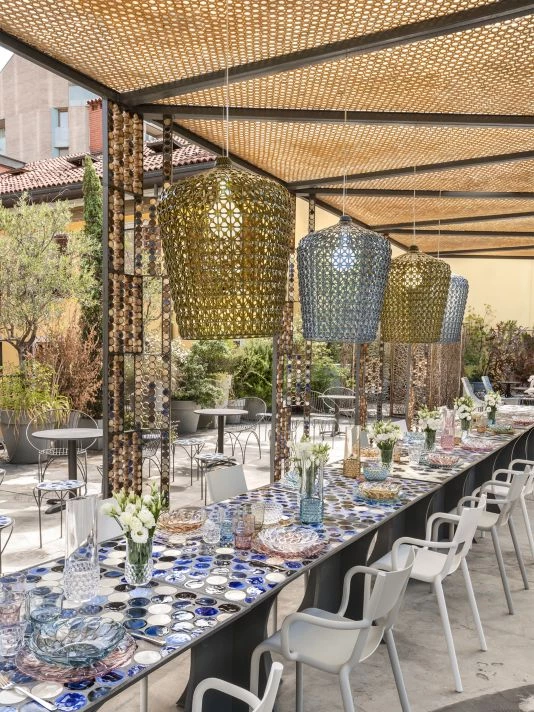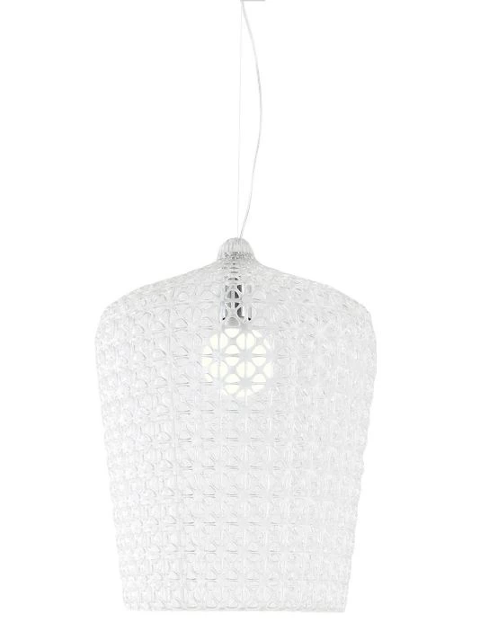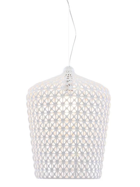 From the Kabuki Collection. The Kabuki floor lamp is injection molded. The technology used makes it possible to create a woven structure similar to lace with a unique perforated surface through which the light is diffused. Available in indoor and outdoor versions.