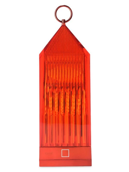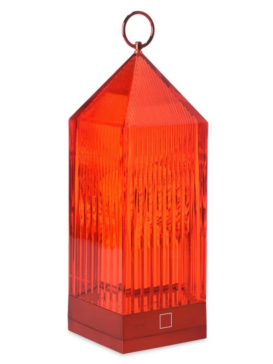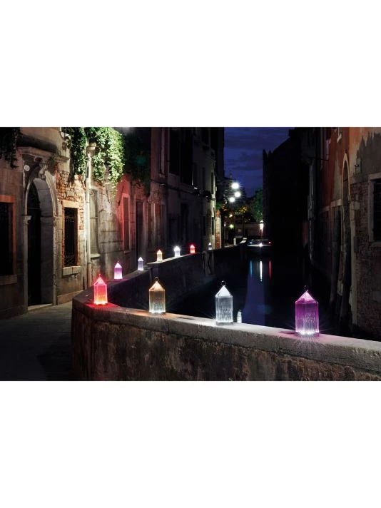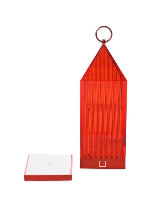From the Lantern Collection. Lantern is an original portable LED, transparent, chargeable, injection-molded lamp that charges by placing it onto a charging base. The light is projected by a graphic effect of the design.