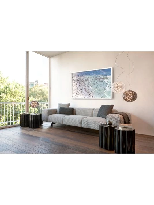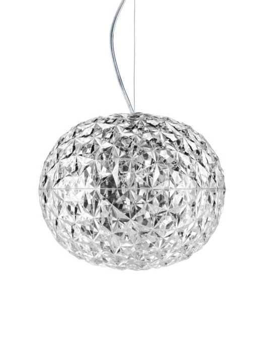 A family of lamps: suspended, for a coffee table and with a metal structure. The distinctive trait is the shape of the slightly elliptical transparent diffuser, which is characterized by a multi-faceted surface, both inside and out, which creates a rich tapestry of reflections.