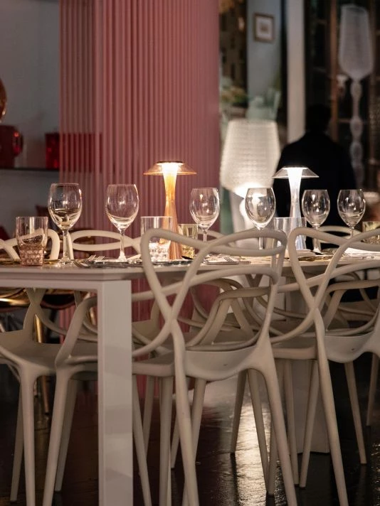 From the Space Collection. A table lamp with an elongated shape. The silhouette recalls the shapes of the Space Needle, the tower that made the Seattle skyline famous.