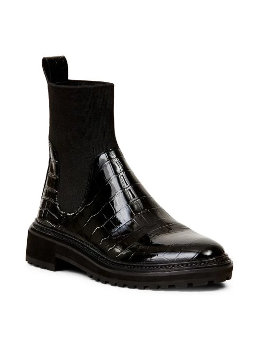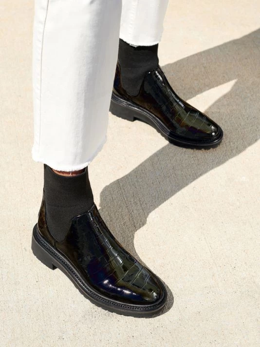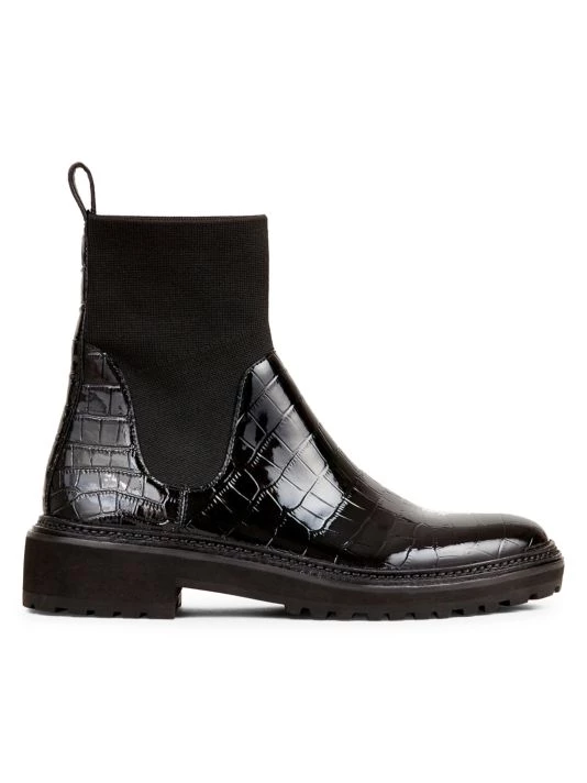 Crafted of crocodile embossed patent leather, these Chelsea boots feature an elastic cuff for all-day comfort.