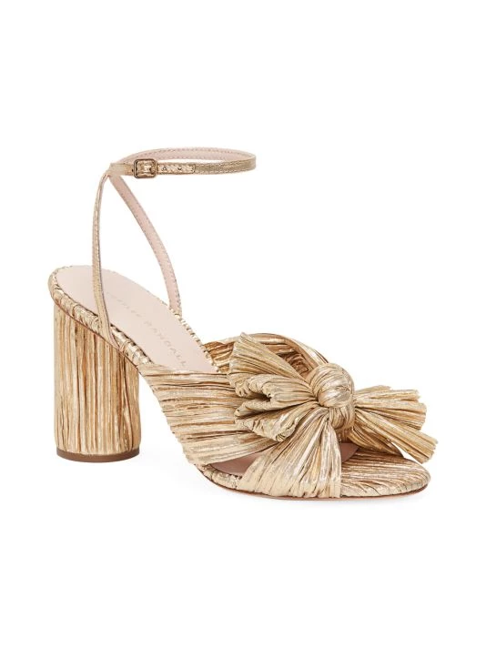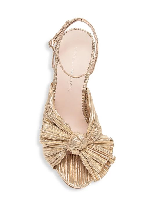 In a pleated finish, these shimmering lamé sandals are accented with signature knotted detail at the toe.