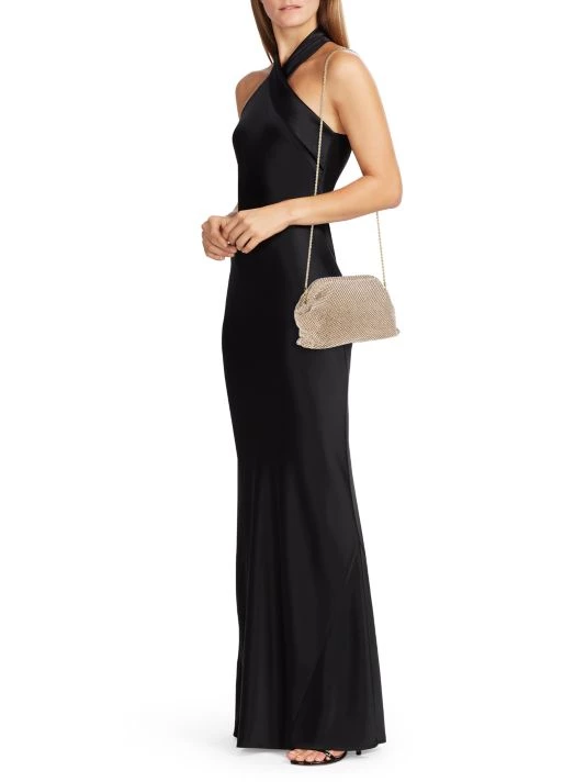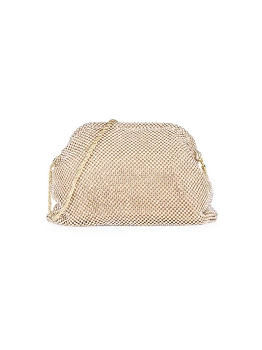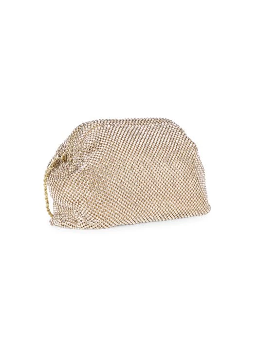 This frame pouch is crafted of goldtone diamanté mesh with a removable twisted chain strap.