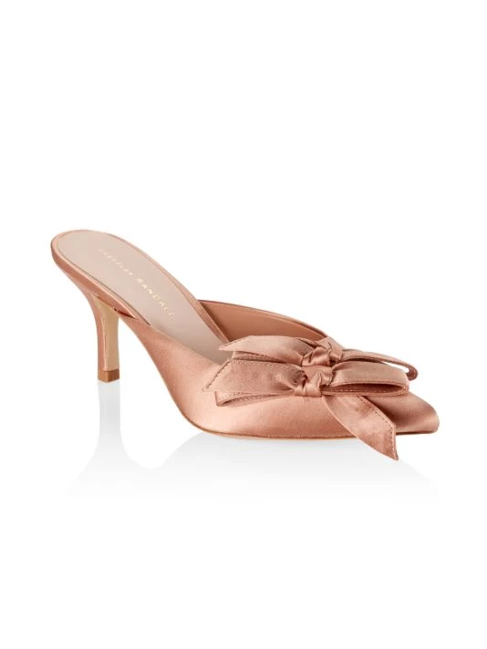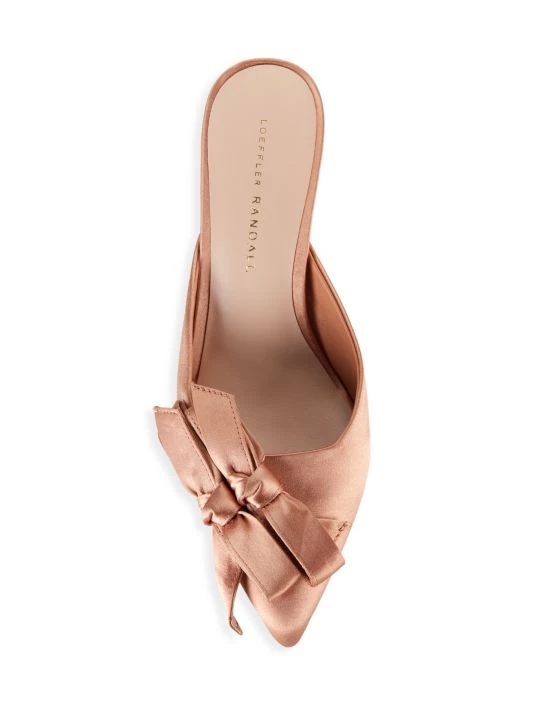 Loeffler Randall’s Fabienne mules are composed of satin adorned with two bows. This elegant pair is anchored by a sleek pointed heel.