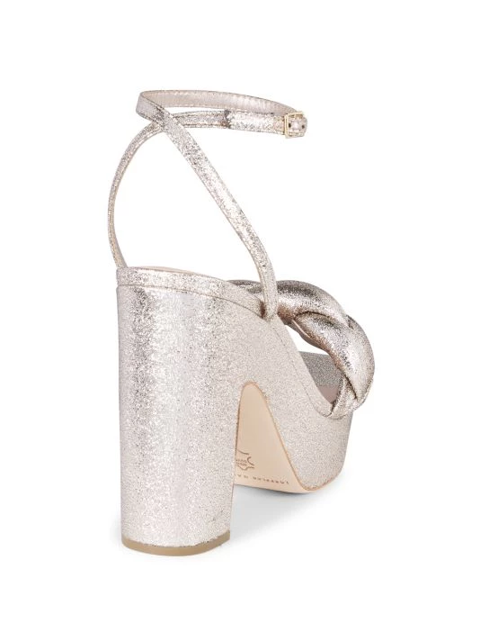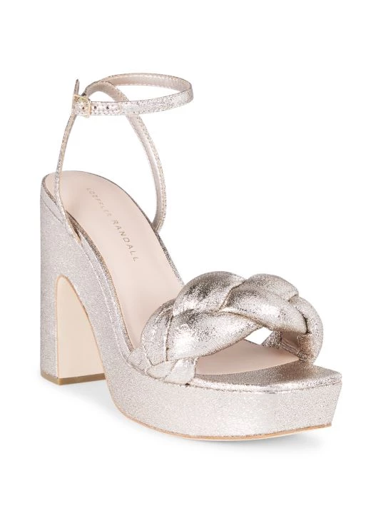 Anchored by a platform and chunky block heel, these metallic sandals are adorned with an oversized braided strap.