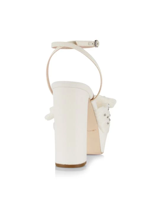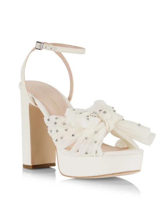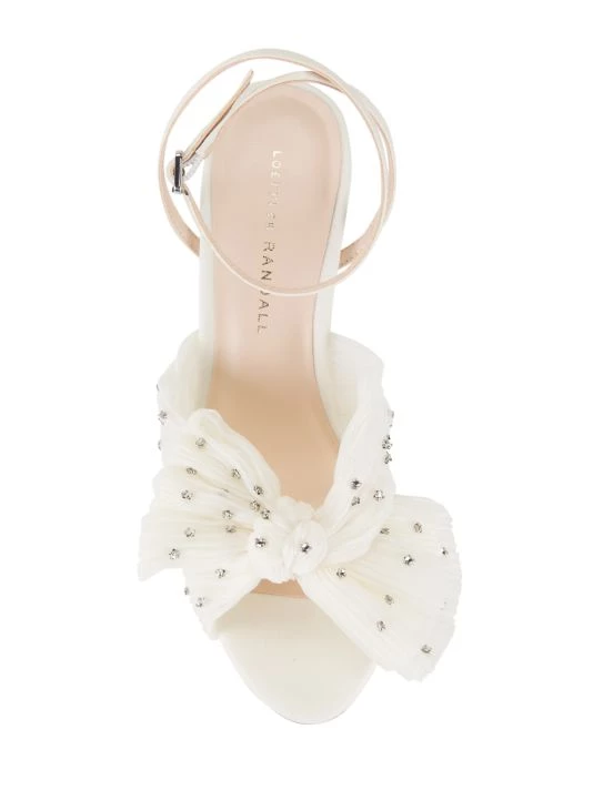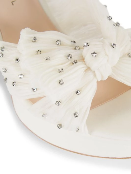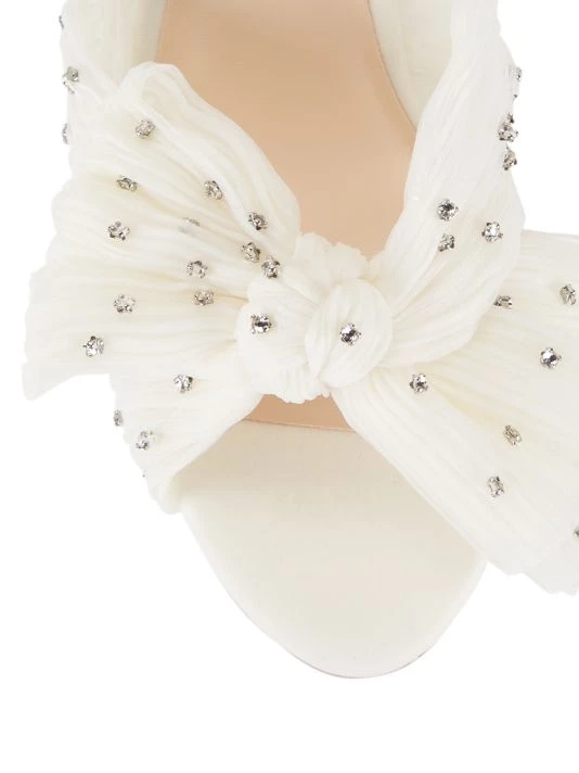 Loeffler Randall’s Natalia sandals are crafted of pleated fabric, topped with a signature knotted bow and rhinestone embellishments.