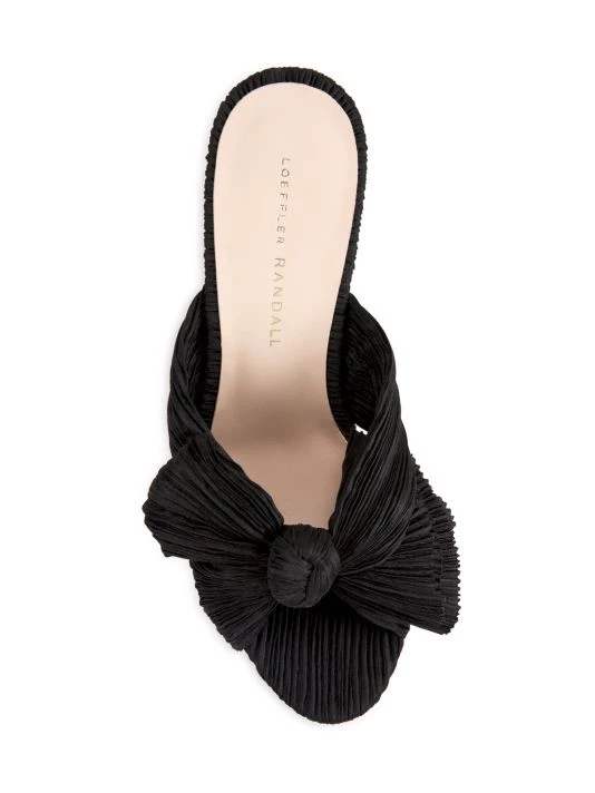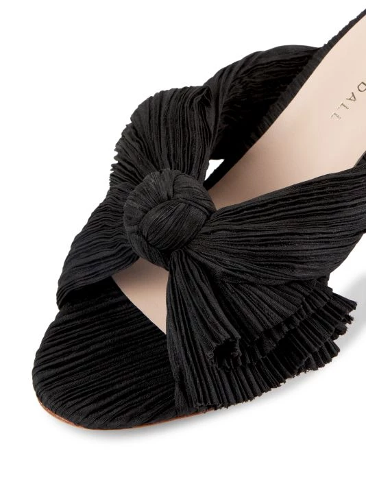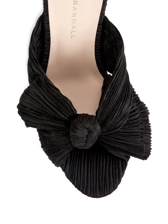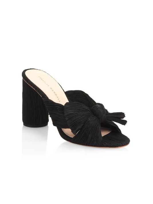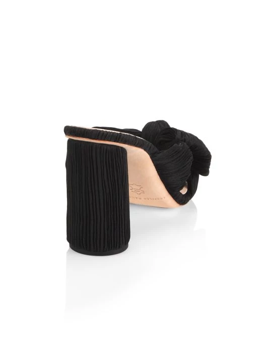 Outstanding mule sandals crafted from pleated fabric and finished with a cylindrical heel.
