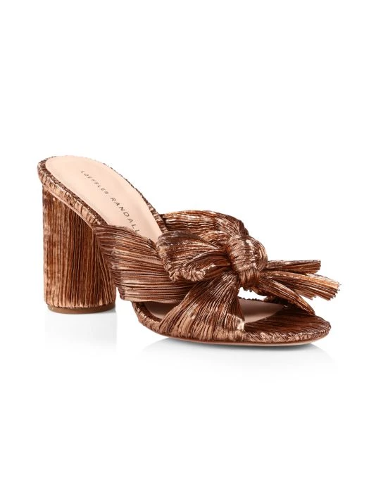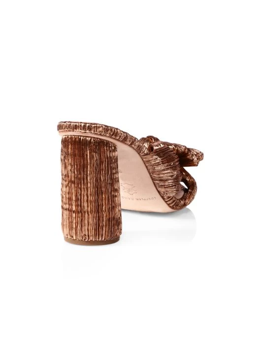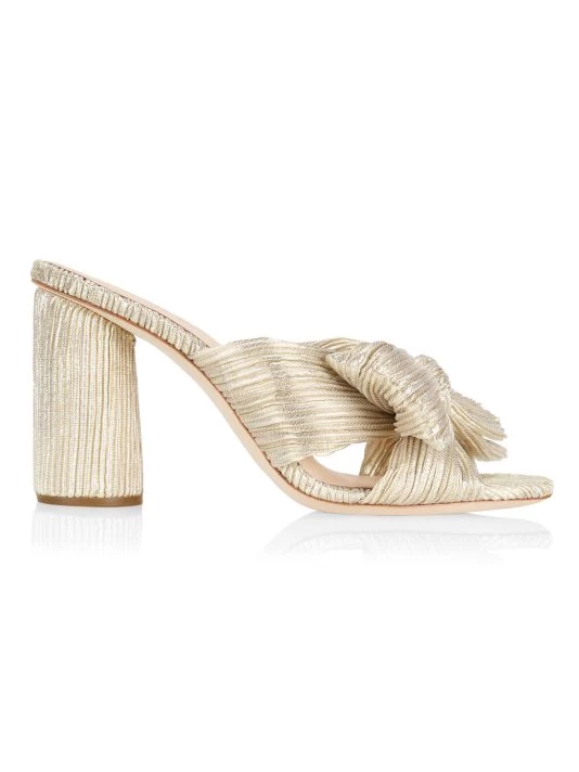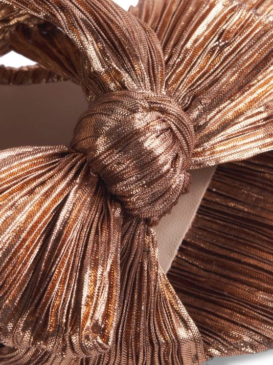Pleated metallic lamé offers a retro-glam feel to these block-heel knotted mules.