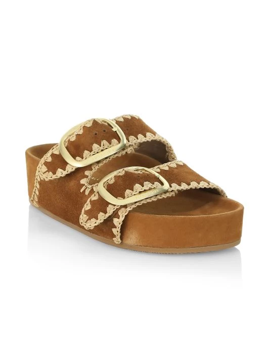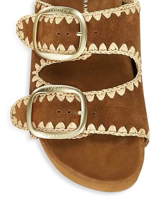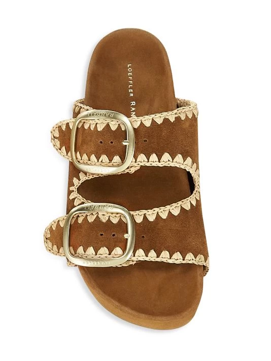 Loeffler Randall’s two-band slides are finished with logo-engraved goldtone buckles. Crafted of buttery-soft suede, these sandals are finished with raffia trim.