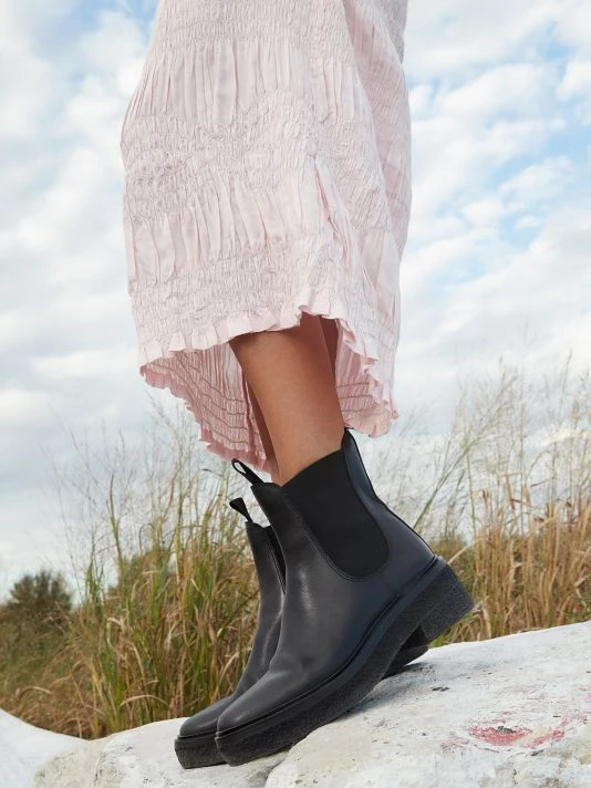 Rugged leather Chelsea boots set atop a chunky block heel exude a look that blends function and fashion.