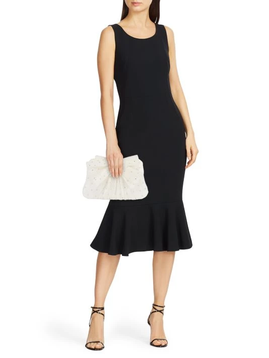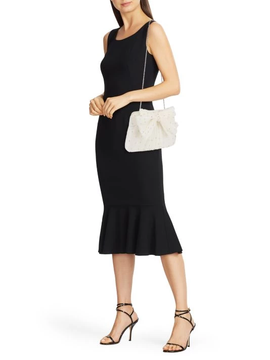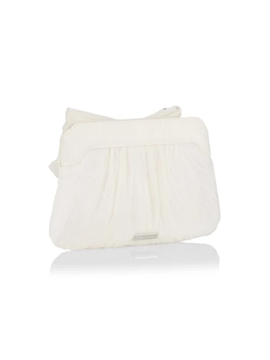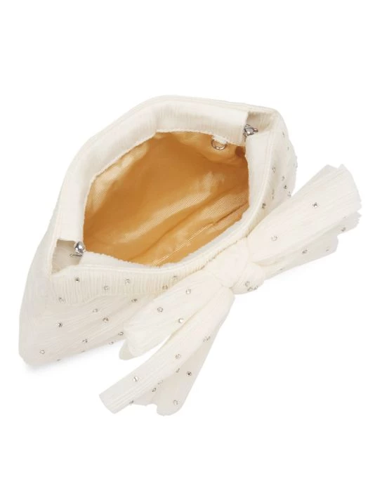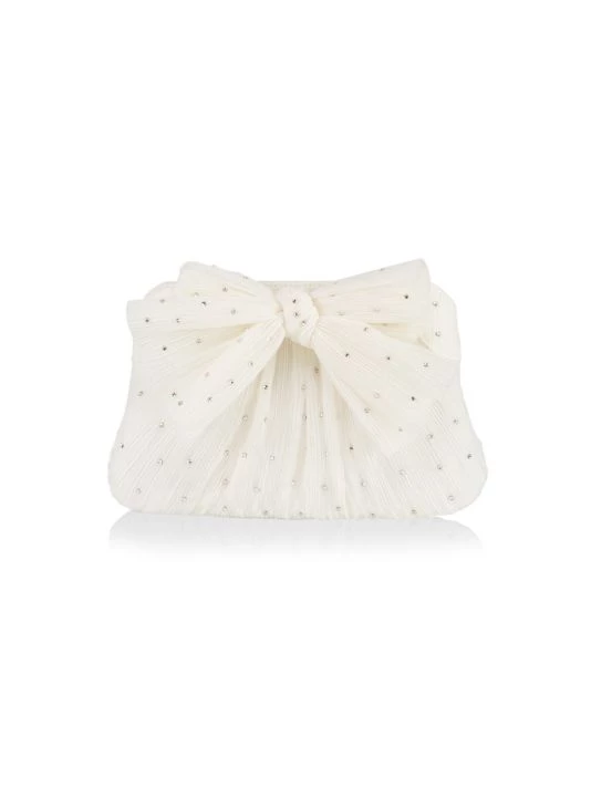 On a delicate chain, the Rayne satin clutch features an intricately pleated finish adorned with lustrous rhinestones and Loeffler Randall’s signature knotted bow accent.
